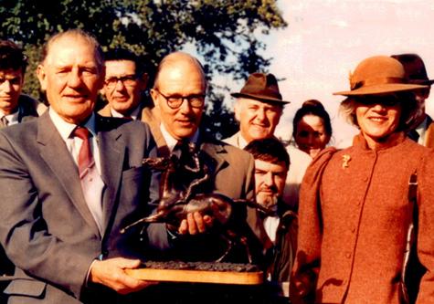 Paddy Burns presenting John Hayden with the Red Sunset Birdcatcher Trophy 1985